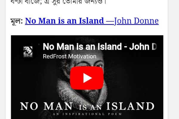 কোনো মানুষ বিচ্ছিন্ন একটি দ্বীপের মতো নয় কেউই একাকী একটি দ্বীপ নয়; প্রত্যেক মানুষi মহাদেশের একটি অংশ, সমগ্রের একটি খণ্ড; একখণ্ড মাটি যদি সাগরের পানিতে ভেসে ভেঙ্গে পড়ে, সমগ্র ইউরোপ কমে, একইভাবে যদি একটি অন্তঃরীপ হারিয়ে যায়, একই হয় যদি ভেসে যায় তোমার বন্ধুর বাড়ি বা তোমার নিজের; যে কোনো মানুষের মৃত্যু আমাকে দুর্বল করে,…