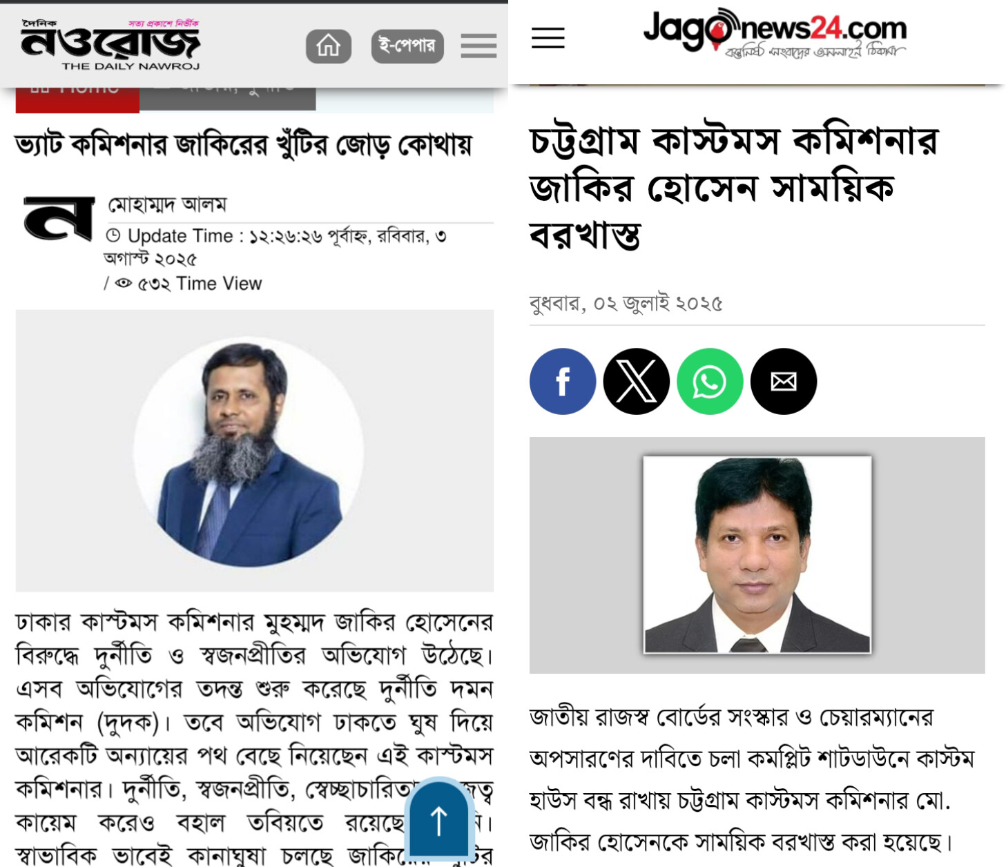 খোঁজ নিয়ে জানা গিয়েছে কাস্টমসে দুইজন জাকির হোসেন রয়েছেন, এবং দুইজনে বর্তমান সময়ে অভিযুক্ত। চট্টগ্রাম কাস্টমস্ হাউজের সাবেক কমিশনার জাকির হোসেনকে সাময়িক বরখাস্তও করা হয়। কিন্তু ভ্যাট গোয়েন্দা অধিদপ্তরের মহাপরিচালক হিসেবে যিনি দায়িত্বে রয়েছেন, তার বিরুদ্ধে অভিযোগের ফিরিস্তি আরো অনেক লম্বা।